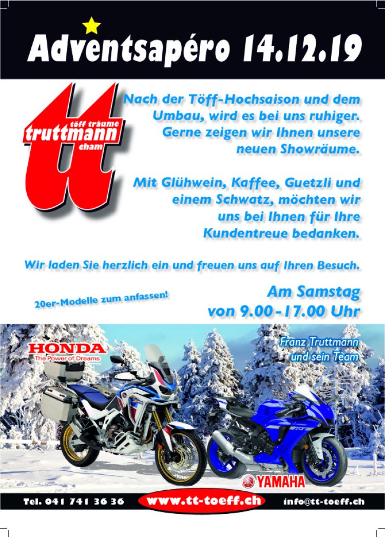 "Natürlich würden wir uns freuen, wenn Sie uns nicht nur virtuell besuchen, sondern zu einem Kaffee vorbeikommen, wenn Sie in Zug oder Luzern unterwegs sind. Töff-Fahren macht auf einer Website weniger Spass, als wenn einem der Wind um die Nase zieht. Kommen Sie in Cham vorbei und träumen Sie mit uns von einer spritzigen Maschine, einer erfrischenden Ausfahrt und dem Genuss der freien Natur. Wir laden Sie ein: Franz, Sandra, Piero, Roli, Dominic, Julian, Andrin und Joe.